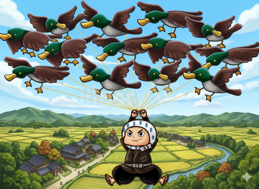 ごんべえさんが、100羽のカモに引っ張られて