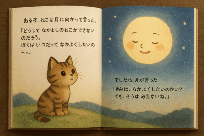なかよくしたいねこがいた。いつも、ほかのねこたちとなかよくしたかった。けれど、なかよしのねこができなかった。 ある夜、ねこは月に向かって言った。 「どうしてなかよしのねこができないのだろう。ぼくはいつだってなかよくしたい...
